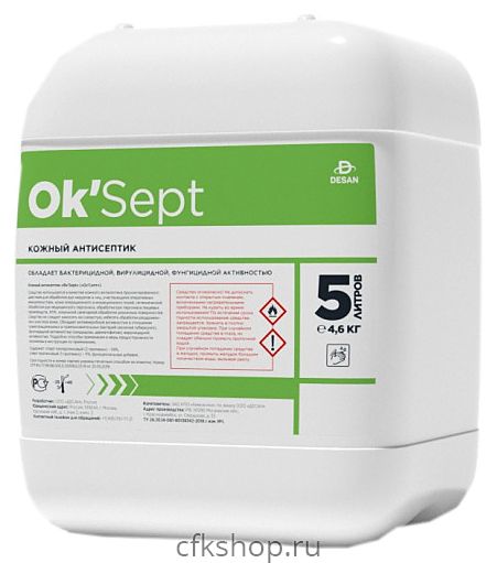 Кожный антисептик ДЕСАН ОkSept 5 л используется в медицинских учреждениях для обработки рук хирургов, медицинского персонала, участвующего в проведении операций, приеме родов и контакте с новорожденными детьми, обработки локтевых сгибов доноров, а также на предприятиях общественного питания и торговли, в салонах красоты, в школьных учреждениях и домах престарелых, в производственных цехах, торговых центрах и отелях для гигиенической обработки рук и профилактической дезинфекции ступней ног. Средство позволяет уничтожать грамположительные (включая микобактерии туберкулеза) и грамоотрицательные бактерии (кишечная палочка, стафилококки, сальмонеллы), вирусы-патогены человека, в том числе вирусы гепатита, ВИЧ, полиомиелита, атипичной пневмонии, гриппа человека, герпеса, птичьего и свиного гриппа, аденовирусов, ротавирусов, а также грибы кандида и трихофитии.
