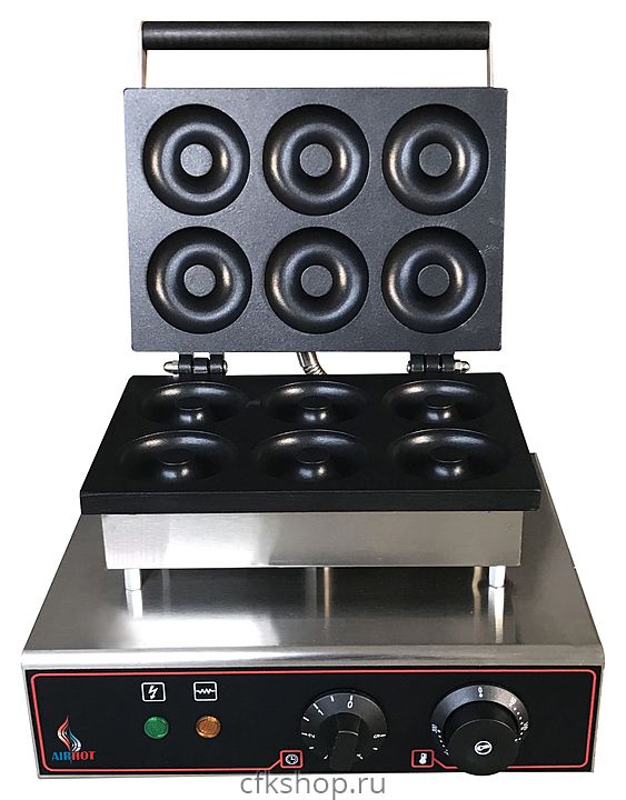 Аппарат Airhot DM-6 используется на предприятиях общественного питания и торговли для приготовления донатсов и пончиков. Модель оснащена чугунными пресс-формами с 6 ячейками для пончиков, терморегулятором и таймером. Корпус выполнен из нержавеющей стали, рабочая поверхность - из чугуна с антипригарным покрытием.