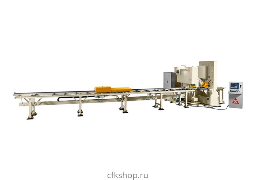 Автоматическая линия для пробивки, маркировки и резки полосового проката и фасонного проката, контролируемая ЧПУ. Благодаря размещению на этой машине установки для маркировки и установки для выполнения поворотного разреза, линия ALFA 500/150 предлагает пользователю различные варианты обработки материала. Именно поэтому эта машина предназначается для производителей металлических конструкций.Полосы передвигаются по каретке, снабженной зажимами для закрепления материала, длина которой достигает 12 м. Боковые пневматические валики помогают удерживать материал в нужном положении. Линия располагает головкой для одного пробойника до 31 мм диаметром для вертикальной части фасонного проката, и тройной пробивной головкой для трех пробойников до 40 мм диаметром для полосового проката и горизонтальной части фасонного проката. Существует также возможность установки головки для выполнения маркировки. Помимо этого, машина снабжена установкой для резки полосового железа до 500 мм шириной и 20 мм толщиной и фасонного проката до 150Х150Х15 мм.