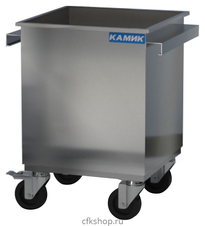 Мусорный бак КАМИК БК-341227 используется на предприятиях общественного питания и торговли для сбора мусора и пищевых отходов. Модель оснащена колесами. Корпус выполнен из нержавеющей стали AISI 430.