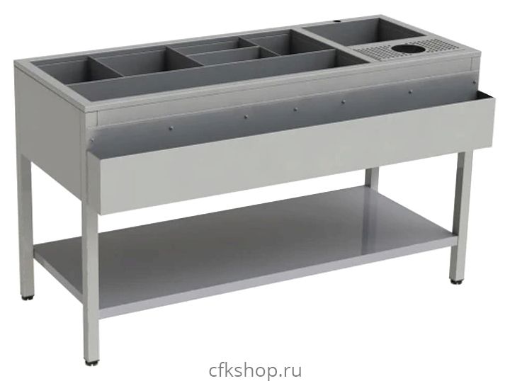 Барная станция Restoinox БСНМО-15/7-ПК предназначена для организации барного места на предприятиях общественного питания и торговли.Модель оснащена 2 сварными мойками, сплошной полкой, фартуком с 3-х сторон и регулируемыми по высоте пластиковыми опорами. Ножки выполнены из квадратной трубы 40х40 мм нержавеющей стали AISI 430, столешница, мойки и фартук - из нержавеющей стали AISI 430.