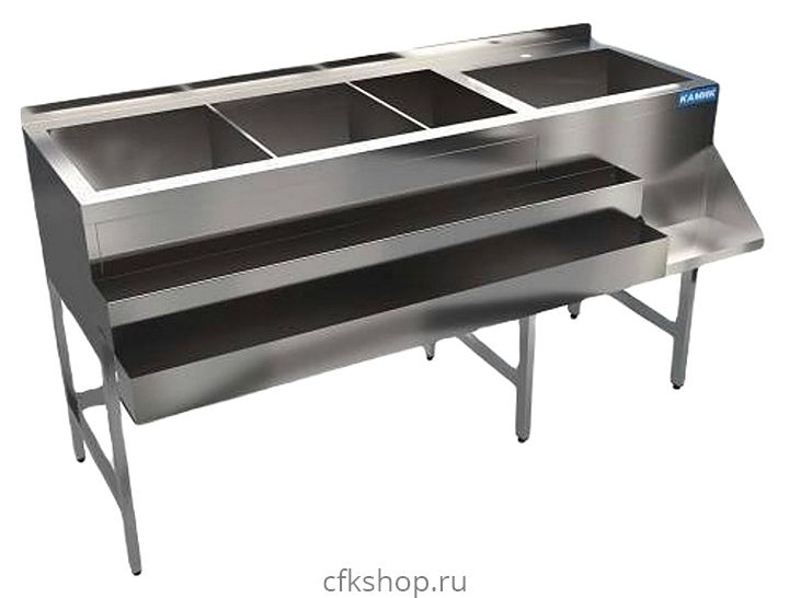 Барная станция КАМИК 2400х600(950)х900(1000) мм предназначена для комплектации барных стоек на предприятиях общественного питания и торговли. Модель оснащена 4 выдвижными ящиками, съемным и не съемным рейлами для бутылок. Корпус изготовлен из нержавеющей стали AISI 430 толщиной 1,5 мм и профиля 40х40 мм, столешница - из стали AISI 304 толщиной 1 мм.