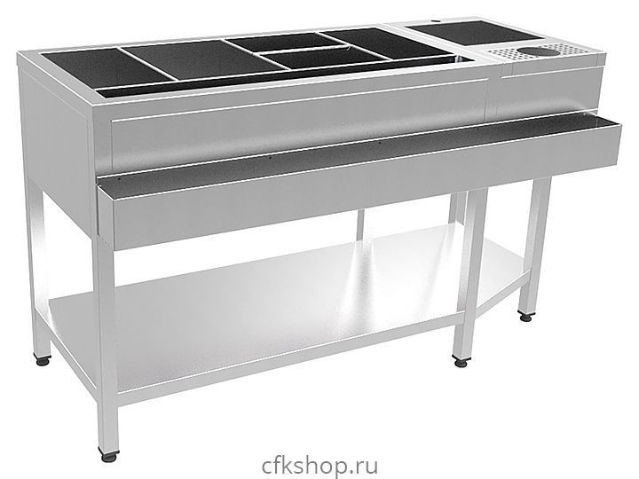 Барная станция Кобор СБ-150/68 предназначена для оборудования барных стоек, их продуктивного функционирования и оптимизации работы сотрудников на предприятиях общественного питания и торговли. Модель оснащена полкой и регулируемыми по высоте опорами ножек. Каркас выполнен из нержавеющей стальной квадратной трубы 40х40 мм, сварные раковины - из нержавеющей стали AISI 430.
