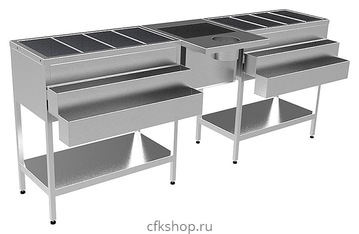 Барная станция Кобор СБ-200/60 предназначена для оборудования барных стоек, их продуктивного функционирования и оптимизации работы сотрудников на предприятиях общественного питания и торговли. Модель оснащена 2 полками и регулируемыми по высоте опорами ножек. Каркас выполнен из нержавеющей стальной квадратной трубы 25х25 мм, сварные раковины - из нержавеющей стали AISI 430.