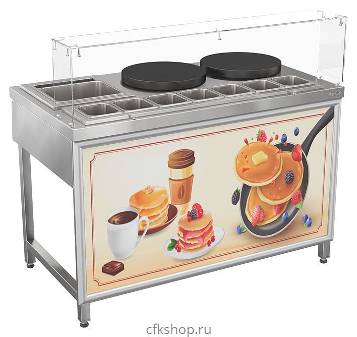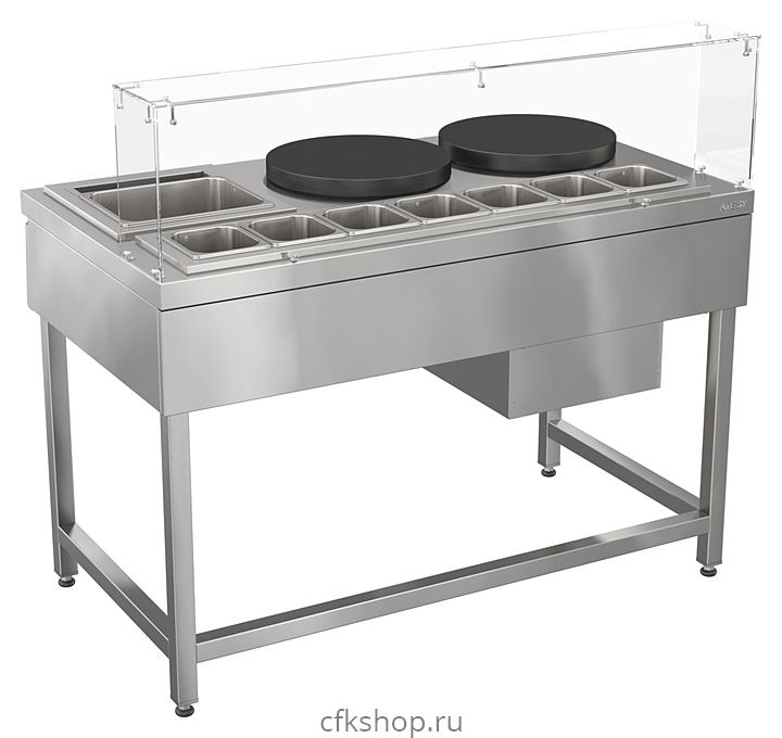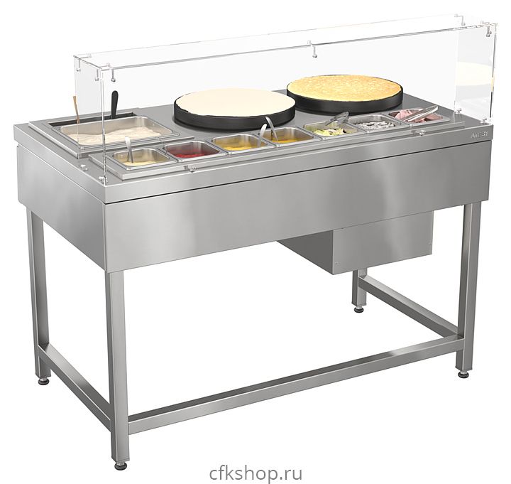 Блинная станция ATESY Лакомка БС-2.400-1350.750-02 используется на предприятиях общественного питания и торговли для комплексного оснащения рабочего места приготовления и раздачи блинов с начинкой. Модель оснащена двухконфорочным электрическим блинным аппаратом и съемными гастронормированными холдерами для размещения емкостей с тестом и начинками. Корпус выполнен из коррозинностойкой стали, стойки каркаса - из нержавеющей трубы сечением 40x40 мм, конфорки - из чугуна.