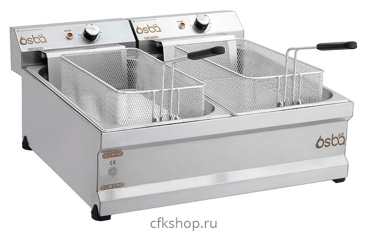 Чебуречница Osba MF 10+10 предназначена для приготовления в большом объеме масла или жира чебуреков, беляшей, пирожков и других продуктов на предприятиях общественного питания и торговли. Модель оснащена индикатором включения, 2 корзинами с крышками и съемными гастроемкостями для слива масла. Корпус, корзины и крышки выполнены из нержавеющей стали.