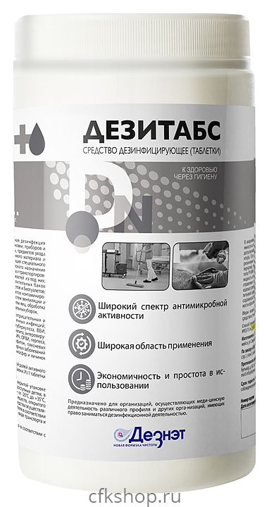 Дезинфицирующее средство Дезнэт Дезитабс, 1 кг используется в медицинских и лечебно-профилактических организациях различного профиля, на предприятиях общественного питания и торговли, в учреждениях образования, социальной сферы, культуры, отдыха, спорта, офисах и складских помещениях для профилактической и очаговой дезинфекции поверхностей в помещениях, жёсткой мебели и предметов обстановки, систем вентиляции и кондиционирования воздуха, спецодежды, оборудования, изделий медицинского назначения, предметов ухода за больными, а также для обеззараживания различных поверхностей и объектов, контаминированных возбудителями паразитарных болезней. Средство представляет собой таблетки круглой формы белого цвета (допускаются оттенки) с характерным запахом хлора. Поставляется в банке.