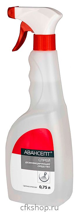 Дезинфицирующее средство Техноэкспорт Авансепт, спрей, 750 мл, используется в медицинских и лечебно-профилактических организациях различного профиля, на предприятиях общественного питания и торговли, в учреждениях социального обеспечения, образования, культуры, спорта и отдыха, в офисах, на объектах коммунально-бытовых служб, в быту для дезинфекции небольших по площади поверхностей в помещениях, в том числе поверхностей медицинских приборов и оборудования, резиновых и пластиковых ковриков, телефонных аппаратов, мониторов, компьютерных клавиатур, мышек. Средство представляет собой прозрачную жидкость от бесцветного до светло-желтого цвета со слабым характерным запахом спирта и применяемой отдушки. Поставляется в виде спрея-распылителя.