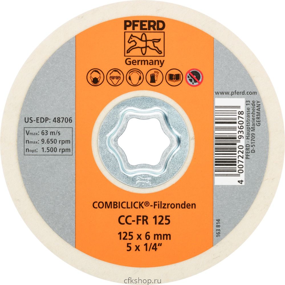 Диск войлочный полировальный CC-FR предназначен для подготовки и полировки деталей средних и больших размеров компания PFERD предлагает COMBICLICK® войлочные диски различных размеров. COMBICLICK® войлочные диски используются для торцевого полирования с применением полировальных паст на угловых шлифовальных машинах с регулируемым числом оборотов.