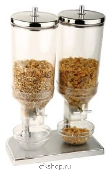 Диспенсер APS 11807 используется на предприятиях общественного питания и торговли для порционной раздачи сыпучих продуктов, таких как мюсли или кукурузные хлопья. Модель оснащена 2 съемными контейнерами. Корпус выполнен из нержавеющей стали, емкости - из поликарбоната.