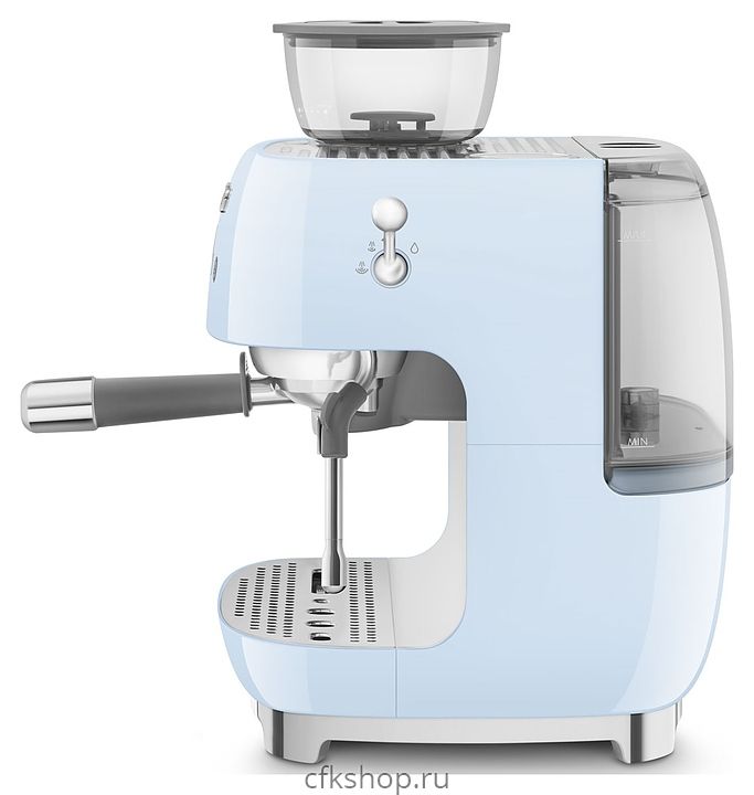 Эспрессо кофемашина SMEG EGF03PBEU предназначена для приготовления кофе эспрессо и напитков на его основе в домашних условиях. Модель оснащена кабелем питания с евровилкой (Shuko) и панелью управления с нажимными кнопками. Корпусы прибора и основания подставки для чашек выполнены из литого алюминия с внешним глянцевым покрытием пастельного голубого оттенка, бойлер, жернова, трубка подачи горячей воды / пара, подогреватель и поддон для чашек, питчер, фильтры, корпусы темпера и холдера – из нержавеющей стали, рычаг подачи пара – из сплава цинка, резервуар для воды с крышкой и контейнер для зерен – из сополимера стирола и акрилонитрила (SAN), крышка контейнера для зерен с интегрированной ручкой – из термопластичного элестомера (TPE), рукоятки холдера и темпера – из серого пластика.