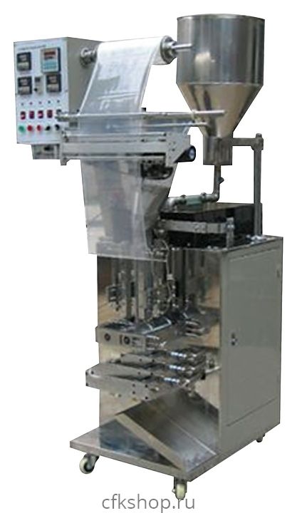 - Полностью автоматитизированный фасовочно-упаковочный цикл: формирование пакета из рулона пленки, дозирование продукта, запайка и обрезание пакета