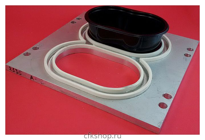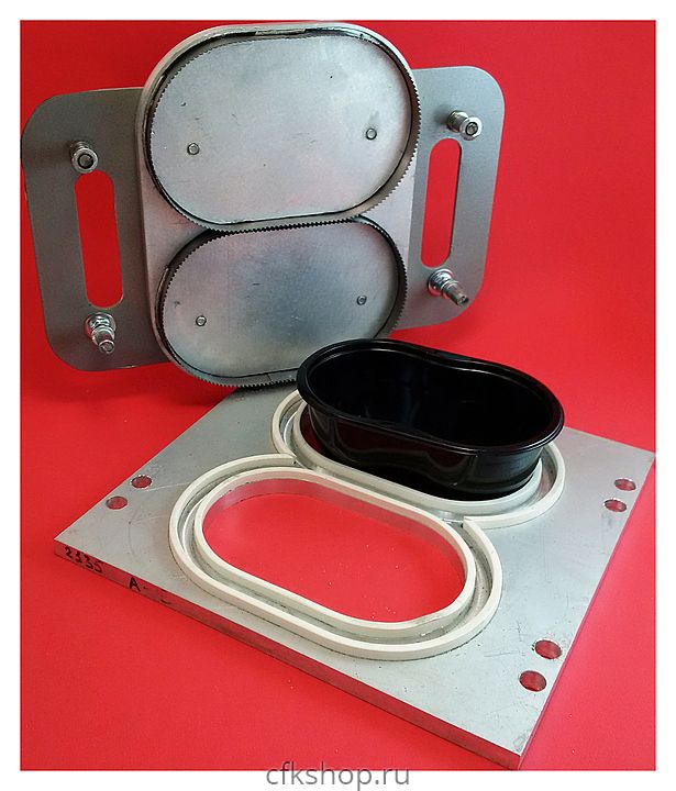 Форма VASSILII № 2135 с 2 отверстиями используется совместно с запайщиком лотков 200х273 мм на предприятиях общественного питания и торговли для запайки полипропиленовых контейнеров овальной формы. Модель оснащена контурной обрезкой.