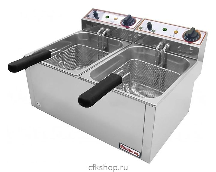 Фритюрница BECKERS FR 6+6LT предназначена для приготовления различных продуктов в большом количестве масла на предприятиях общественного питания и торговли. Модель оснащена аварийными термостатами, холодной зоной и световыми индикаторами режимов работы. Корпус и ванна выполнены из нержавеющей стали, корзины - из хромированной проволоки, ручка - из термостойкого материала.