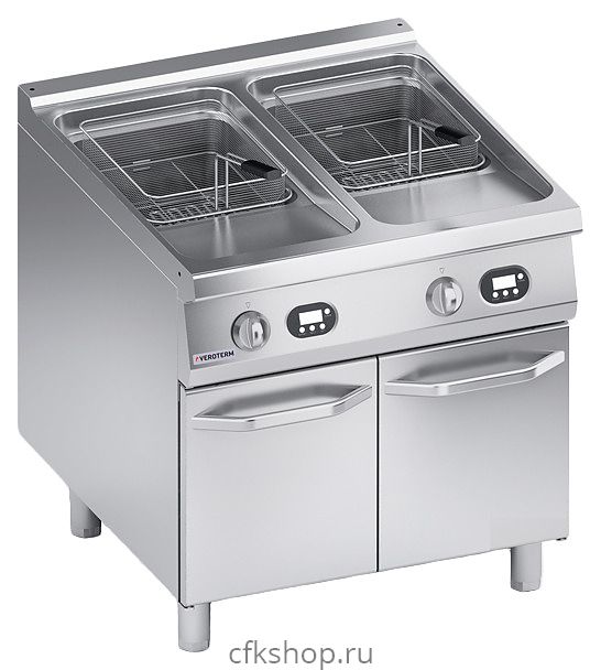 Напольная электрическая фритюрница VEROTERM VT4FEEP1020 используется на предприятиях общественного питания и торговли для приготовления картофеля-фри и других блюд путем обжарки в большом количестве масла. Модель оснащена задним бортом, техническим отделением с 2 дверьми с горизонтальными рукоятками, 2 поворотными переключателями, 2 электронными панелями управления с кнопочной клавиатурой и цифровыми дисплеями. Оборудование выполнено из нержавеющей стали AISI 430.