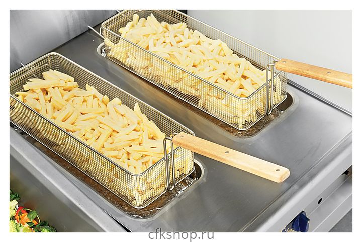 Газовая фритюрница Abat ГФК-90.2П предназначена для приготовления различных продуктов в большом количестве масла на предприятиях общественного питания и торговли. Модель оснащена системой газ-контроля, пьезорозжигом, лотком для сбора масла и регулируемыми по высоте ножками. Облицовка и боковые панели выполнены из нержавеющей стали AISI 304 толщиной 1 мм, задняя обшивка - из крашеного оцинкованного металла толщиной 1 мм.