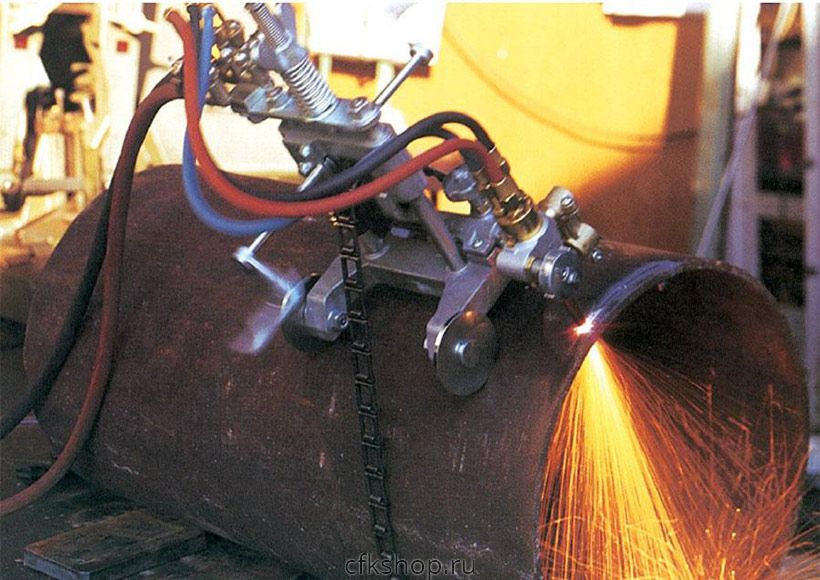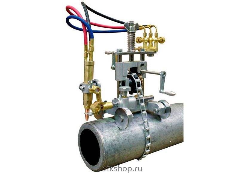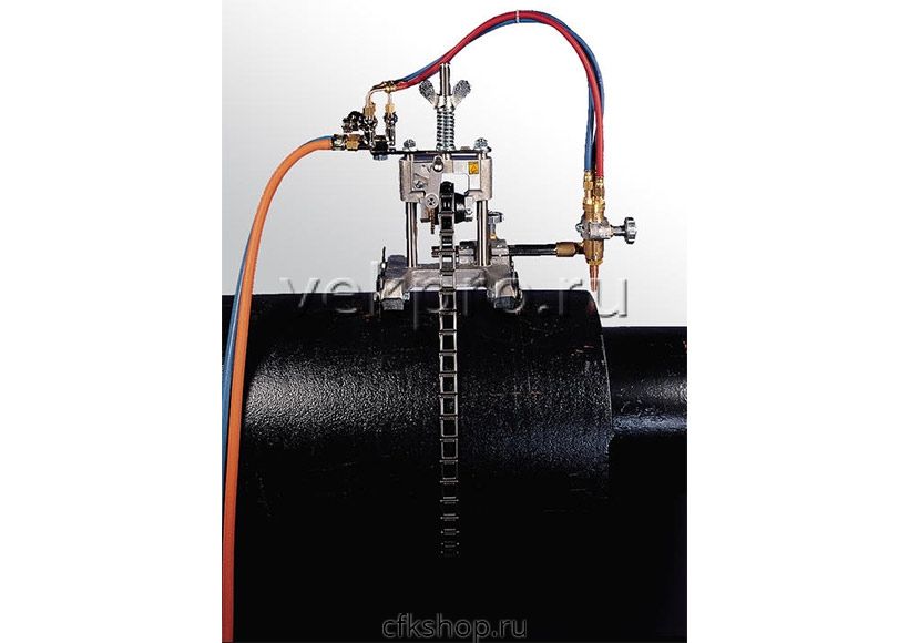 Приводная цепь состоит из простых, надежно скрепленных звеньев. Легкость установки и снятия звеньев цепи позволяет осуществлять их быструю замену для наладки машины при резке труб разных диаметров. На кронштейне горелки установлена угловая шкала, с помощью которой можно регулировать величину угла снятия фасок.