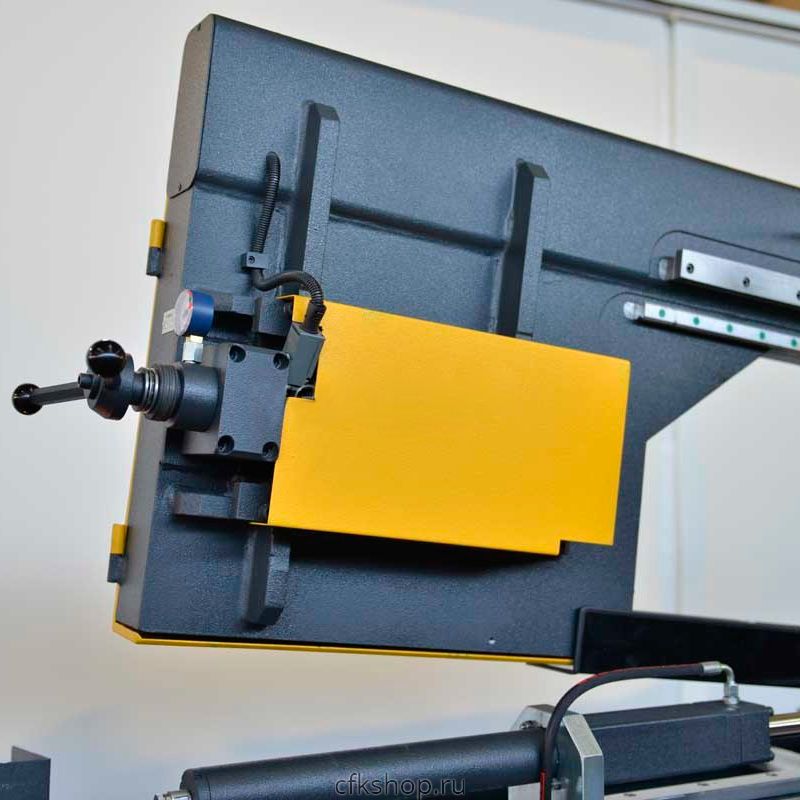 Стандартное приспособление ленточнопильного станка для регулировки натяжения режущего полотна. Предусмотрен концевой выключатель для отключения при ослаблении его натяжения, а также манометр для проверки. В случае длительной остановки станка рекомендуется ослабить натяжение ленточного полотна для продления его срока службы