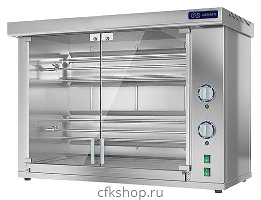 Гриль для кур KAYMAN ГЭ-2Ш A используется на предприятиях общественного питания и торговли для жарки тушек кур, цыплят, куриных окорочков, грудок и других продуктов питания. Модель оснащена 2 съемными шампурами и ТЭНами, расположенными на задней стенке камеры. Корпус выполнен из пищевой нержавеющей стали AISI 430, все внутренние элементы, соприкасающиеся с продуктами - из пищевой нержавеющей стали, двери - из термостойкого стекла.