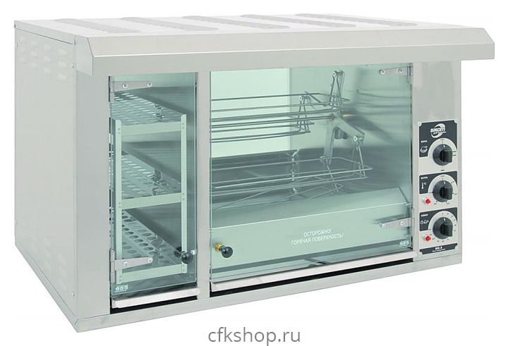 В комплект поставки входит съемный вертел, 4 люльки-корзины, поддон, кассета витрины и поддон витрины.