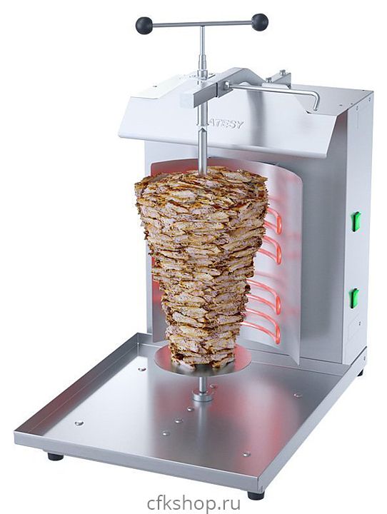 - Принцип действия заключается в том, что мясная нарезка, сформированная в цилиндр, насаживается на специальный нож, который вращается вокруг своей оси около ТЭНов - прожаренный слой мяса срезается остро заточенным ножом и сразу же используется для приготовления блюда