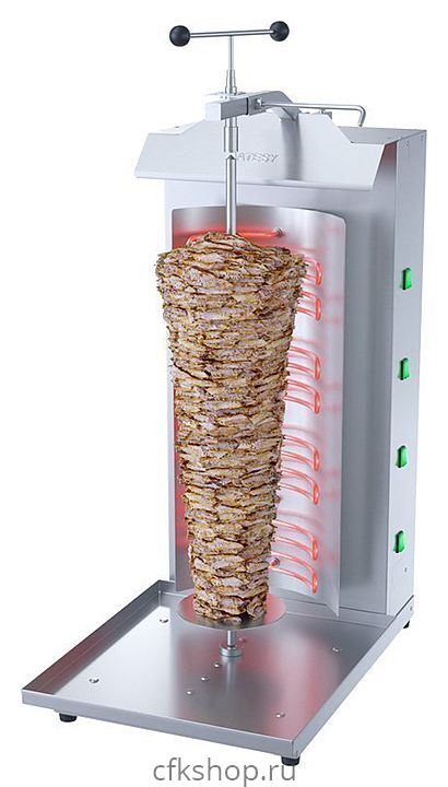 - Принцип действия заключается в том, что мясная нарезка, сформированная в цилиндр, насаживается на специальный нож, который вращается вокруг своей оси около ТЭНов - прожаренный слой мяса срезается остро заточенным ножом и сразу же используется для приготовления блюда