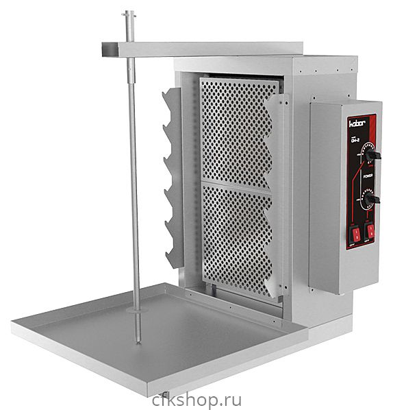 Гриль для шаурмы Кобор GM-2 используется на предприятиях общественного питания и торговли для обжарки большого количества различных видов мяса и птицы для приготовления начинки из рубленного мяса для шаурмы и других блюд. Боковые держатели позволяют использовать шампура для приготовления шашлыка и кебабов. Модель оснащена 2 ТЭНами. Корпус выполнен из пищевой нержавеющей стали.