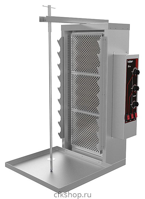 Гриль для шаурмы Кобор GM-3 используется на предприятиях общественного питания и торговли для обжарки большого количества различных видов мяса и птицы для приготовления начинки из рубленного мяса для шаурмы и других блюд. Боковые держатели позволяют использовать шампура для приготовления шашлыка и кебабов. Модель оснащена 3 ТЭНами. Корпус выполнен из пищевой нержавеющей стали.