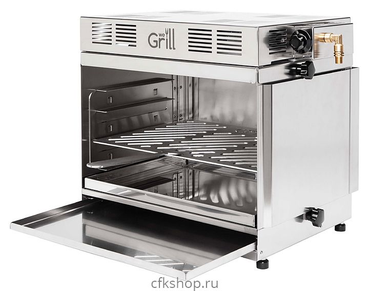 Газовый гриль WeGrill In&Out предназначен для приготовления различных блюд путем обжигания (грилливания), запекания, карамелизации, гратинирования, а также с использованием технологии Sous Vide на предприятиях общественного питания и торговли. Поверхность мяса и рыбы, обработанной таким образом, мгновенно «запечатывается»: на ней появляется нежная корочка, а весь сок и аромат остаются внутри. Модель оснащена 3 инфракрасными газовыми горелками и 2 поддонами для жира. Корпус изготовлен из нержавеющей стали AISI 304.