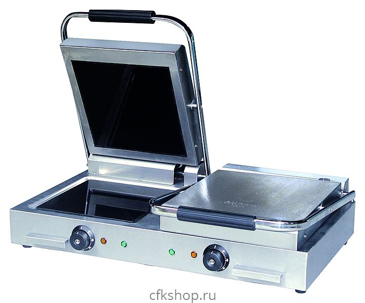 Прижимной гриль Kocateq FC2 предназначен для жарки мяса, птицы, рыбы и овощей, приготовления стейков, гамбургеров и горячих сэндвичей на предприятиях общественного питания и торговли. Модель оснащена механической панелью управления и термостатом для регулировки температуры. Корпус выполнен из нержавеющей стали AISI 304, ножки - из пластика.