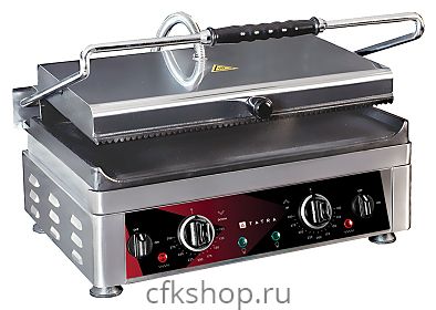 Прижимной гриль Tatra TCG 4527 RS DT предназначен для жарки мяса, птицы, рыбы, овощей и быстрого разогрева полуфабрикатов на предприятиях общественного питания и торговли. Модель оснащена электромеханической панелью управления с терморегулятором и индикаторами питания и нагрева, системой независимой регулировки температуры нагрева верхней и нижней поверхностей и емкостью для сбора жира. Корпус выполнен из нержавеющей стали.