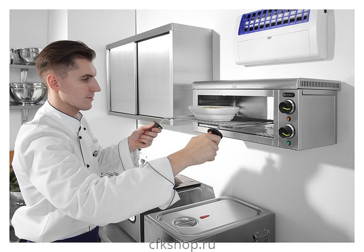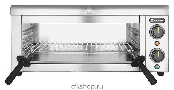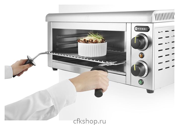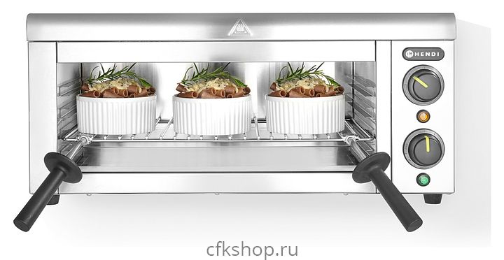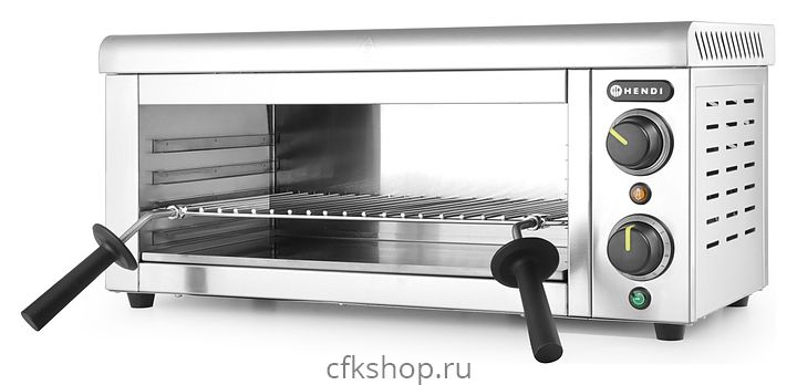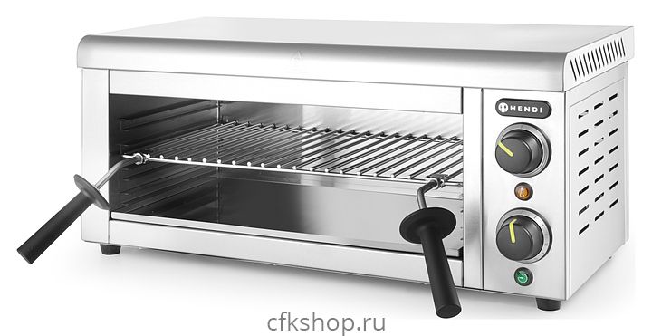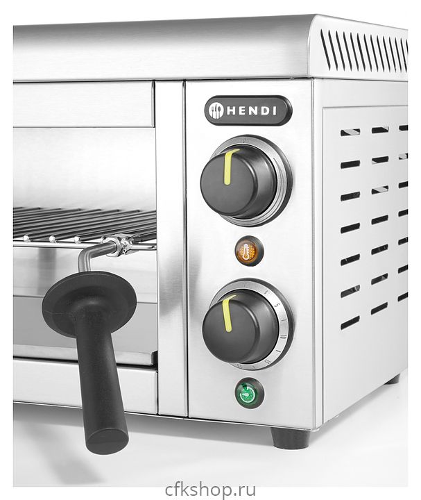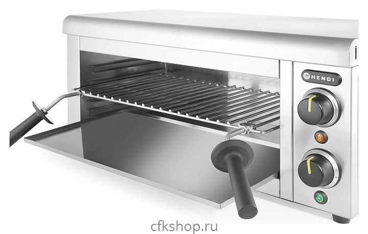 Гриль-саламандер HENDI 264119 предназначен для жарки мяса, птицы, рыбы, овощей, приготовления сендвичей и запеканок, а также быстрого разогрева полуфабрикатов на предприятиях общественного питания и торговли. Модель оснащена решеткой с изолированными ручками, термостатом, индикатором температуры, поддоном для сбора крошек и устойчивыми ножками. Изделие выполнено из нержавеющей стали.