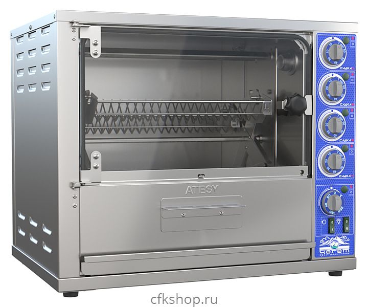 Гриль-шашлычница ATESY ЧЕГЕТ ГШК-4.3-02 используется на предприятиях общественного питания и торговли для приготовления шашлыков из мяса, птицы, рыбы, морепродуктов и овощей. Модель оснащена терморегулятором, расположенным на передней панели и позволяющим плавно регулировать интенсивность нагрева. Корпус выполнен из пищевой нержавеющей стали AISI 430, садки - из нержавеющего прутка.