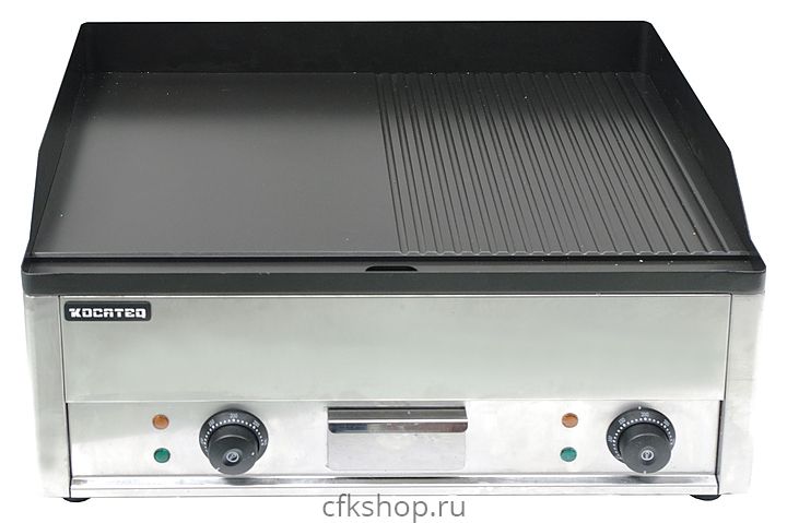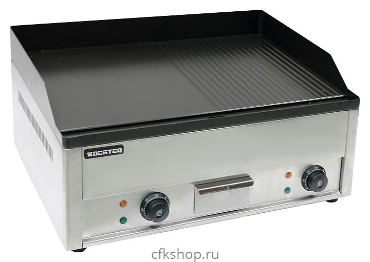 Гриль-сковорода Kocateq GH600HRNW предназначена для приготовления жареных мясных блюд, яичницы, жареной рыбы, оладьев, котлет и гамбургеров на предприятиях общественного питания и торговли. Модель оснащена термостатом для регулировки температуры и защитным термостатом, автоматически отключающим напряжение при повреждении основного термостата. Рабочая поверхность выполнена из стали толщиной 10 мм с тефлонированным покрытием, корпус - из нержавеющей стали AISI 430 толщиной 0,8 мм, ножки - из пластика.