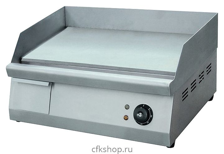 Гриль-сковорода Kocateq GH610 предназначена для приготовления жареных мясных блюд, яичницы, жареной рыбы, оладьев, котлет и гамбургеров на предприятиях общественного питания и торговли. Модель оснащена термостатом для регулировки температуры и защитным термостатом, автоматически отключающим напряжение при повреждении основного термостата. Плоская рабочая поверхность выполнена из специального теплопроводящего сплава, корпус - из нержавеющей стали AISI 304, ножки - из пластика.