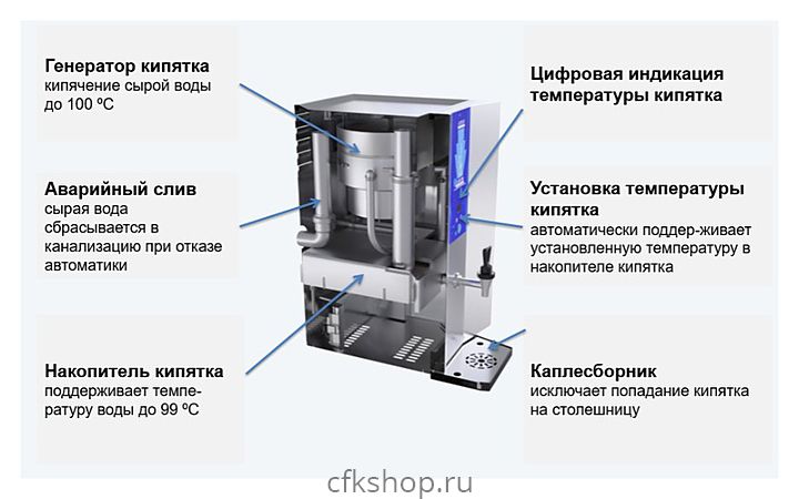 - Автоматическое поддержание установленной температуры в накопителе кипятка