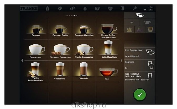 Кофемашина Franke A1000 FM СМ 1G H1 используется на предприятиях общественного питания и торговли, в офисах и отелях для приготовления чая, кофе и кофейных напитков. Модель оснащена интерактивным сенсорным экраном диагональю 10,4 дюйма с 3 различными интуитивно понятными режимами работы и возможностью демонстрации изображений, видео- и аудиофайлов во время приготовления напитков и в качестве заставки.