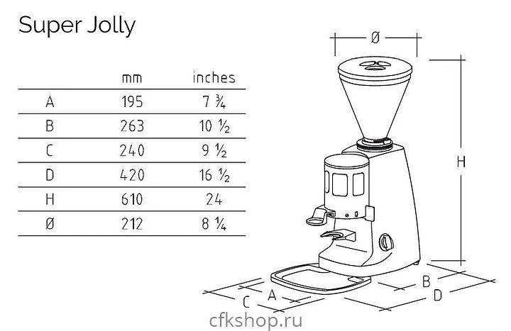 Аппарат Mazzer Super Jolly MANUAL предназначен для получения молотого кофе из зерен. Оборудование оснащено плоскими стальными жерновами, встроенным дозатором, благодаря которому можно установить счетчик порций кофе и оборудована встроенным темпером.