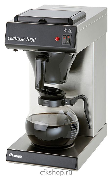 Кофеварка Bartscher Contessa 1000 A190053 используется в отелях, офисах, частных домах и квартирах. Модель оснащена подогреваемой поверхностью, размещенной наверху аппарата, что помогает поддерживать свежесваренный напиток в горячем состоянии. Корпус выполнен из хромоникелевой стали и пластика, колба - из стекла.