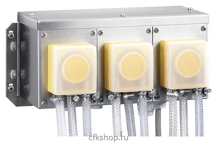 В комплект поставки входят 3 дозирующих насоса DOS P2, корпус для настенного крепления DOS G2, шланги и всасывающие трубки.