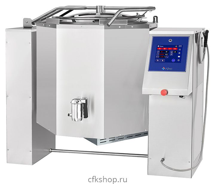 Варочный котел Abat КПЭМ-250-ОМП с функциями опрокидывания, перемешивания и охлаждения предназначен для приготовления вторых и третьих блюд, бульонов, соусов и десертов, а также для кипячения воды на предприятиях пищевой промышленности и общественного питания. Модель оснащена панелью управления с электронным TFT-экраном, пультом программного управления и сливным краном, позволяющим производить слив готового продукта без опрокидывания.