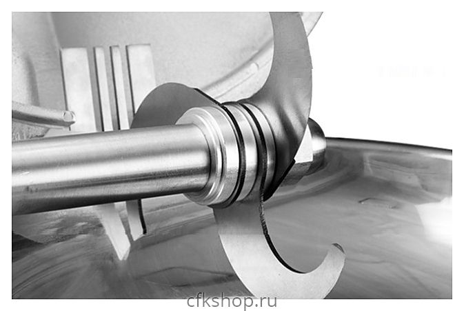 - Чаша вращается перпендикулярно плоскости вращения 3-лопастного серповидного ножа