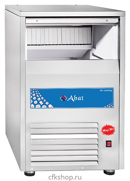 Льдогенератор Abat ЛГ-46/25К-02 предназначен для производства кубикового льда на предприятиях общественного питания и торговли. Модель оснащена отодвигающейся вовнутрь дверцей, системой автоматического отключения в случае отсутствия подачи воды на охлаждение конденсатора, утечки хладагента, повышенной нагрузки на мотор-редуктор и переполнения бункера льдом и регулируемыми по высоте ножками.