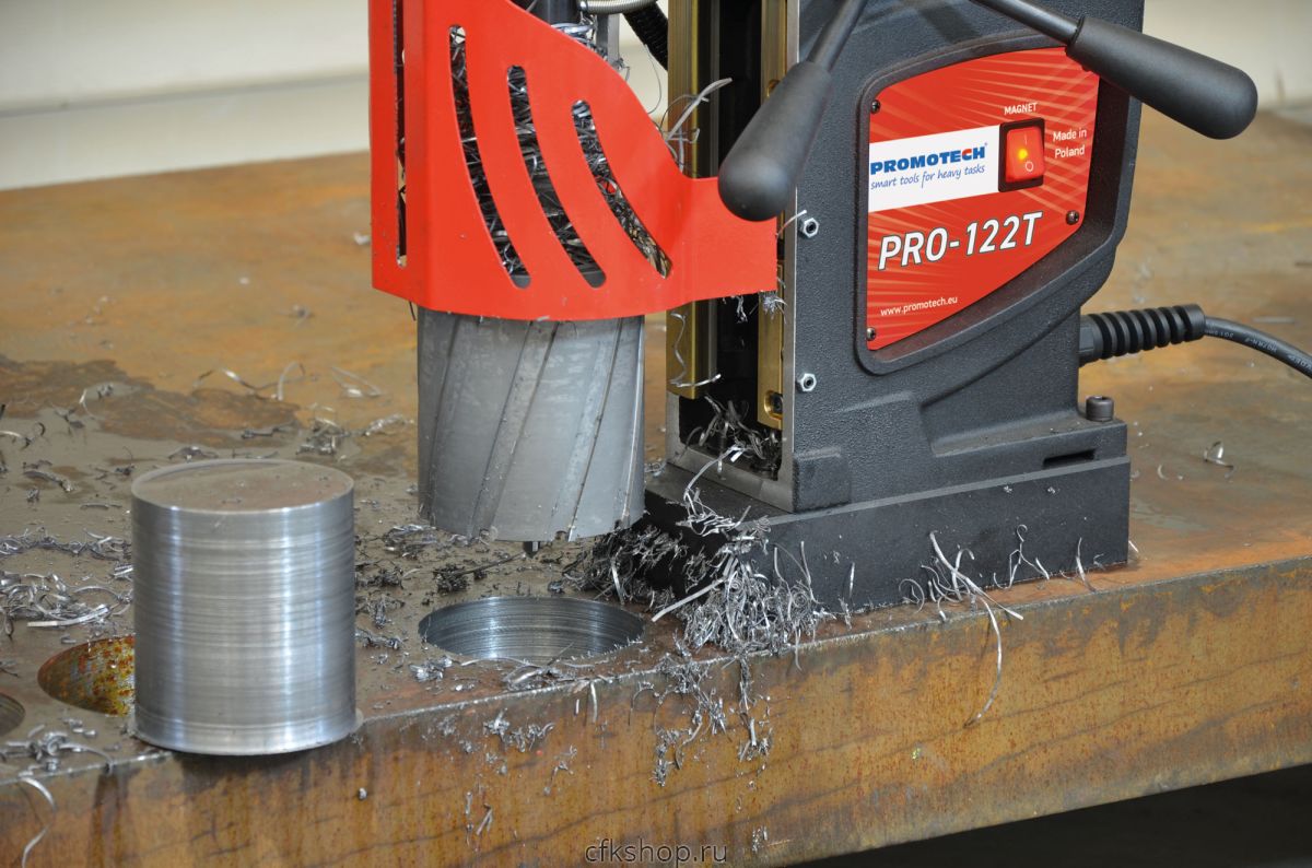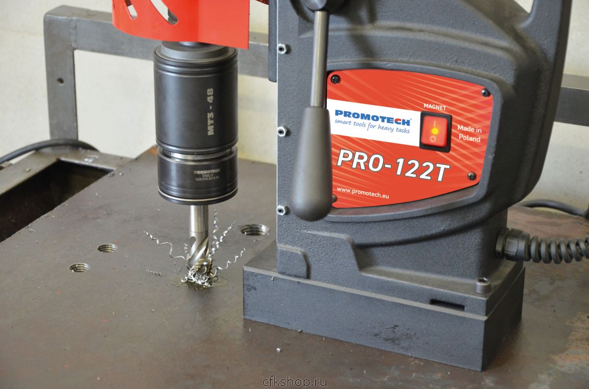 Станок PRO-122T предназначен для промышленного выполнения отверстий и нарезания резьбы. Мощный двигатель с переменной скоростью обеспечивает выполнения отверстий корончатым сверлом диаметром 120 (4-3/4 дюйма) и спиральным сверлом диаметром до 31,75 мм (1-1/4 дюйма). Реверсивный режим работы станка позволяет нарезать резьбу до M30 с помощью новой системы нарезания резьбы Promotech. Четырехступенчатая коробка передач с плавной регулировкой оборотов в диапазоне от 75 до 570 об/мин позволяет устанавливать оптимальную скорость в зависимости от диаметра отверстия, марки стали или качества инструмента. Интеллектуальная система регулирования скорости поддерживает постоянную скорость двигателя независимо от меняющихся нагрузок. Система светодиодных индикаторов позволяет контролировать состояние машины во время работы, что повышает безопасность и продлевает срок службы станка и используемого инструмента.Особенности и преимущества: