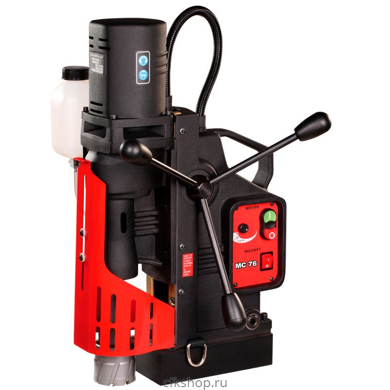 Жесткость конструкции сверлильной машины сделала возможность применения мощного привода с высоким крутящим моментом наряду с системой контроля силы притяжения (MPAC). Достаточно большая прижимная сила магнита – 19500 Н позволяет использовать и крепить магнитный сверлильный станок в горизонтальном и вертикальном положении. Стоит отметить, что мощность привода примерно на 20% превышает показатели аналогичных машин, а за счет высокого крутящего момента станок МС-76 гарантирует работу без потери мощности на низких оборотах. Не стоит забывать и про такой параметр магнитной сверлильной машины как потребление электроэнергии. В мс-76 установлено энергосберегающее электромагнитное основание (ESB) с увеличенной силой притяжения к неровным поверхностям (MFSC), что дает дополнительную устойчивость при выполнении различного вида работ. Предусмотрена защита от перегрузок, обеспечивающая непревзойденную надежность и безопасность.