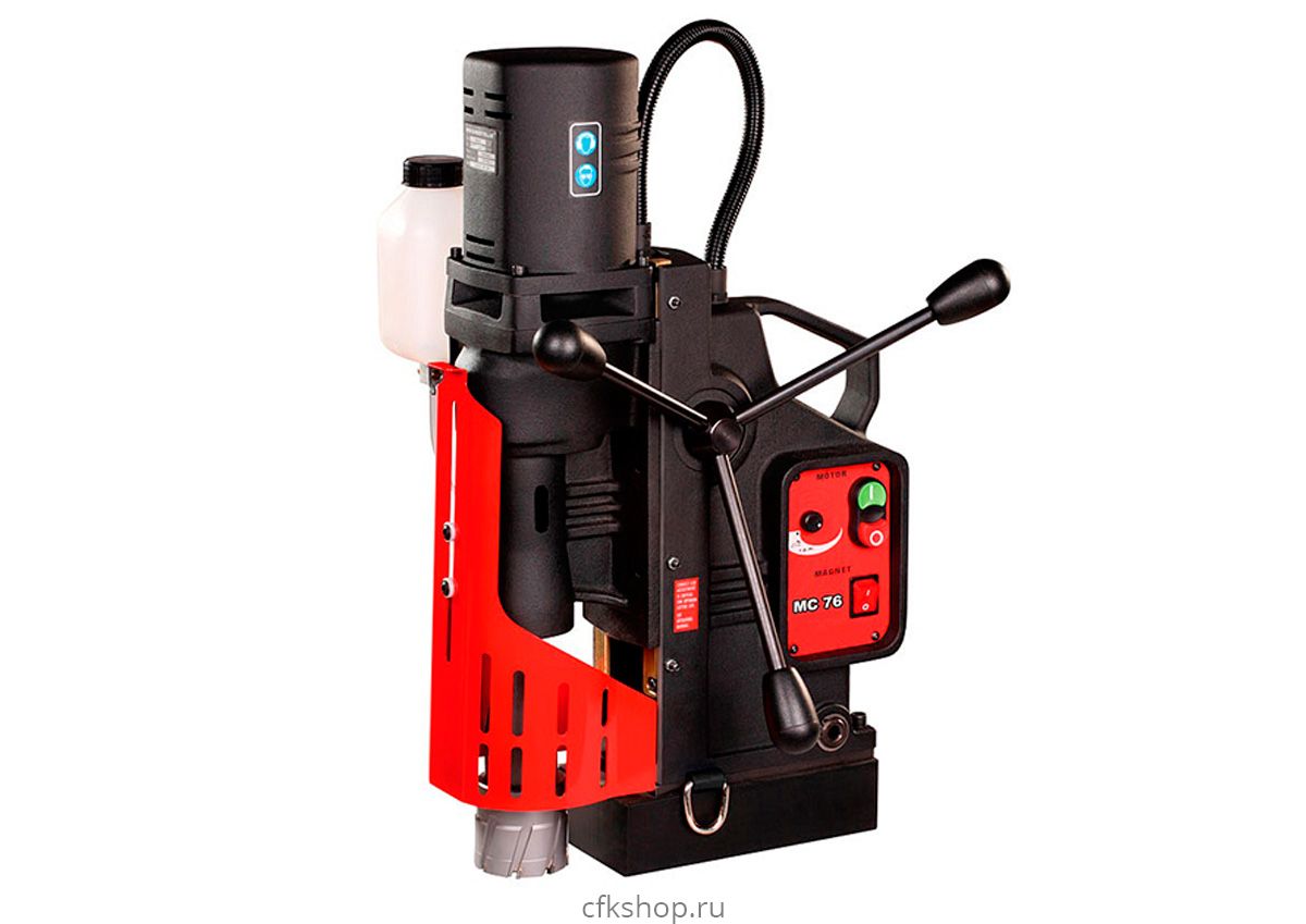 Сверлильная машина МС-76 – многофункциональный сверлильный станок на магнитном основании с посадочным гнездом шпинделя Конус Морзе 3 (КМ3). Это модель средней мощности с приводом на 1650 Вт, которая позволяет производить различные виды обработки отверстий: сверление сплошным сверлом диаметром до 32 мм или корончатой фрезой — до 76 мм, зенкование диаметром до 63 мм, а так же нарезание резьбы до М24. Максимальная глубина сверления достигает 76 мм.