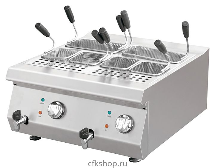 Макароноварка Kocateq 1M0CP1E класса Medium-Duty используется на предприятиях общественного питания и торговли для отваривания и размораживания кукурузы, фрикаделек, макаронных изделий, пельменей, вареников, овощей, фруктов и прочих продуктов. Модель оснащена механическим термостатом для регулировки температуры и защитным термостатом. Ванна выполнена из специальной стали толщиной 1,5 мм, декоративные ручки с накладками - из нержавеющей стали, поверхности, соприкасающиеся с продуктами, выполнены из нержавеющей стали AISI 304 толщиной 1 мм, дно и задняя стенка - из нержавеющей стали AISI 201 толщиной 1 мм.