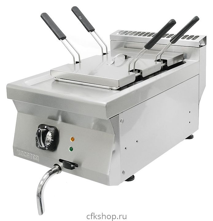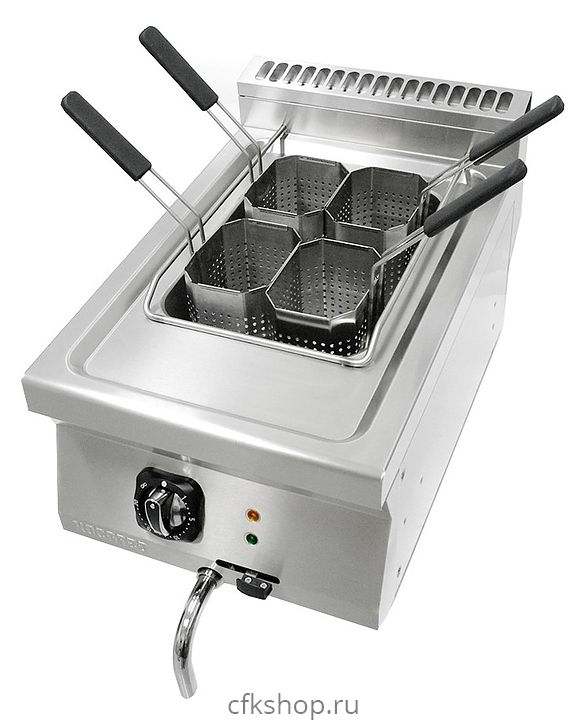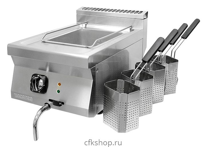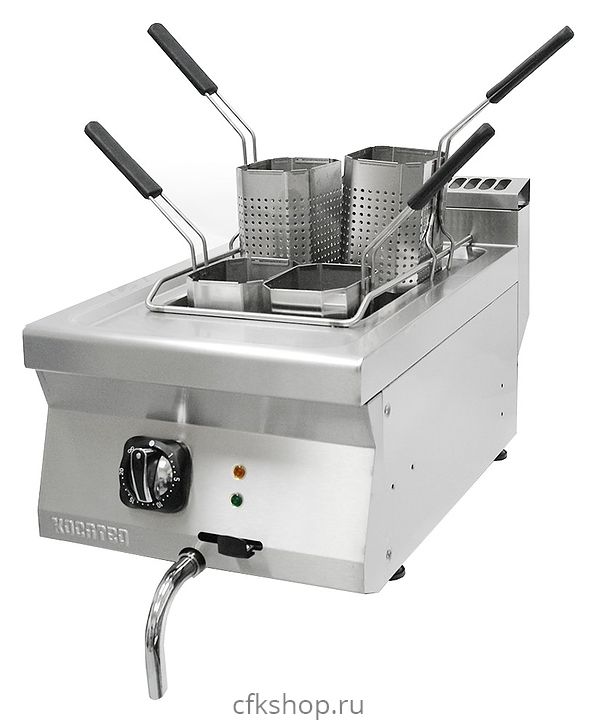 Макароноварка Kocateq MCEP47 используется отдельно или в составе тепловой линии для отваривания и размораживания кукурузы, фрикаделек, макаронных изделий, пельменей, вареников, овощей, фруктов и прочих продуктов на предприятиях общественного питания и торговли. Модель оснащена термостатом для регулировки температуры и световыми индикаторами подключения к сети и нагрева. Корпус выполнен из нержавеющей стали.