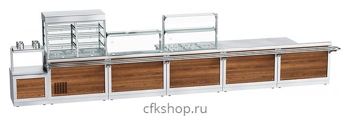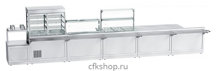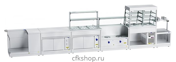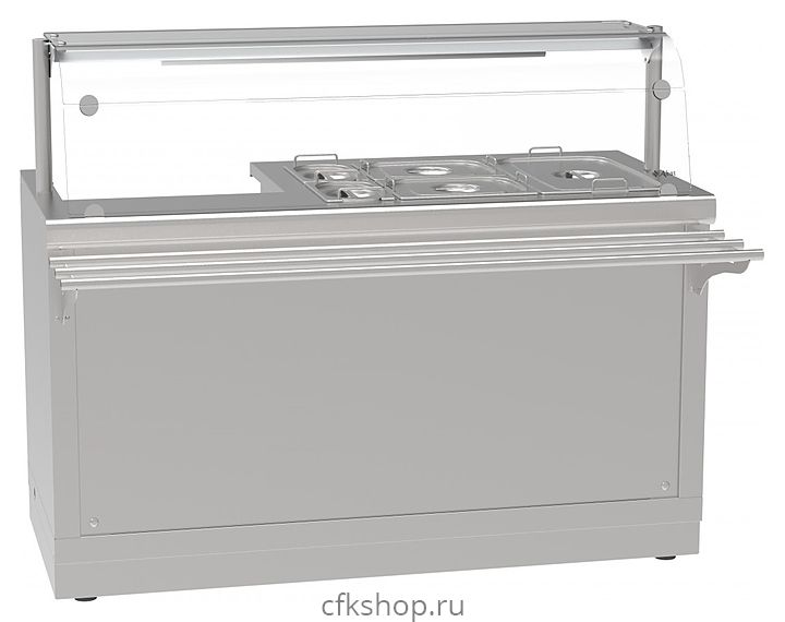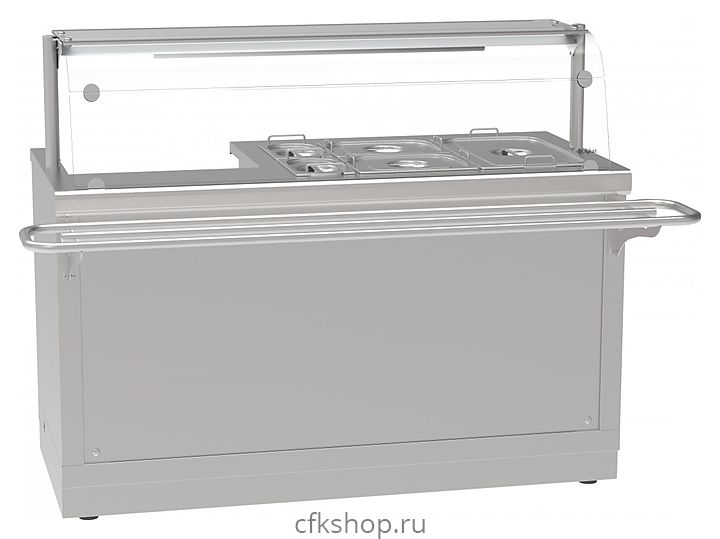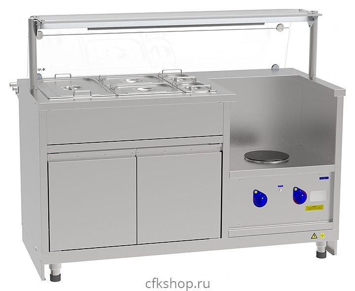 Универсальный мармит Abat ЭМКУ-70Х используется в составе линии раздачи HOT-LINE для эффектной демонстрации, кратковременного хранения и поддержания в горячем состоянии первых и вторых блюд на предприятиях общественного питания и торговли. Модель оснащена электрической конфоркой для наплитной посуды, ванной для подогрева гастроемкостей, нейтральным шкафом с распашными дверцами для хранения кухонного инвентаря и панелью управления с 2 поворотными переключателями. Корпус выполнен из нержавеющей стали, полка – из стекла.