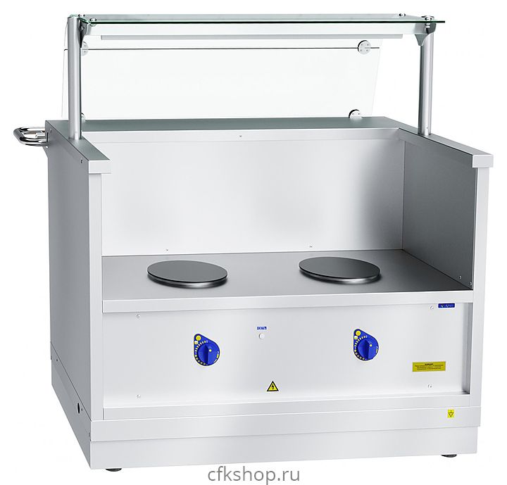Мармит Abat ПМЭС-70Х используется в составе линии раздачи HOT-LINE на предприятиях общественного питания и торговли для поддержания в горячем состоянии наплитной посуды с первыми блюдами и их раздачи потребителю. Модель оснащена 2 круглыми конфорками и 2 переключателями, позволяющими регулировать их температуру. Корпус и панели выполнены из нержавеющей стали.